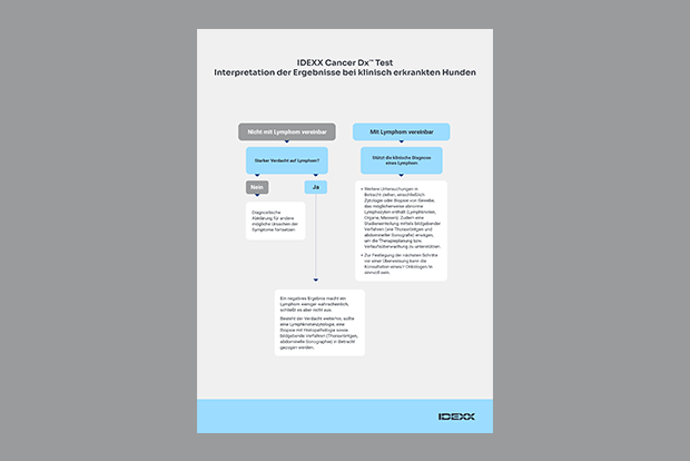 - Unterstützung der Diagnosestellung: Der IDEXX Cancer Dx Test kann bei Hunden durchführt werden, bei denen Verdacht auf ein Lymphom besteht, beispielsweise aufgrund von Auffälligkeiten bei der allgemeinen Untersuchung, Blutuntersuchungen und anamnestischen Angaben von Krankheit oder Verhaltensänderungen zu Hause.