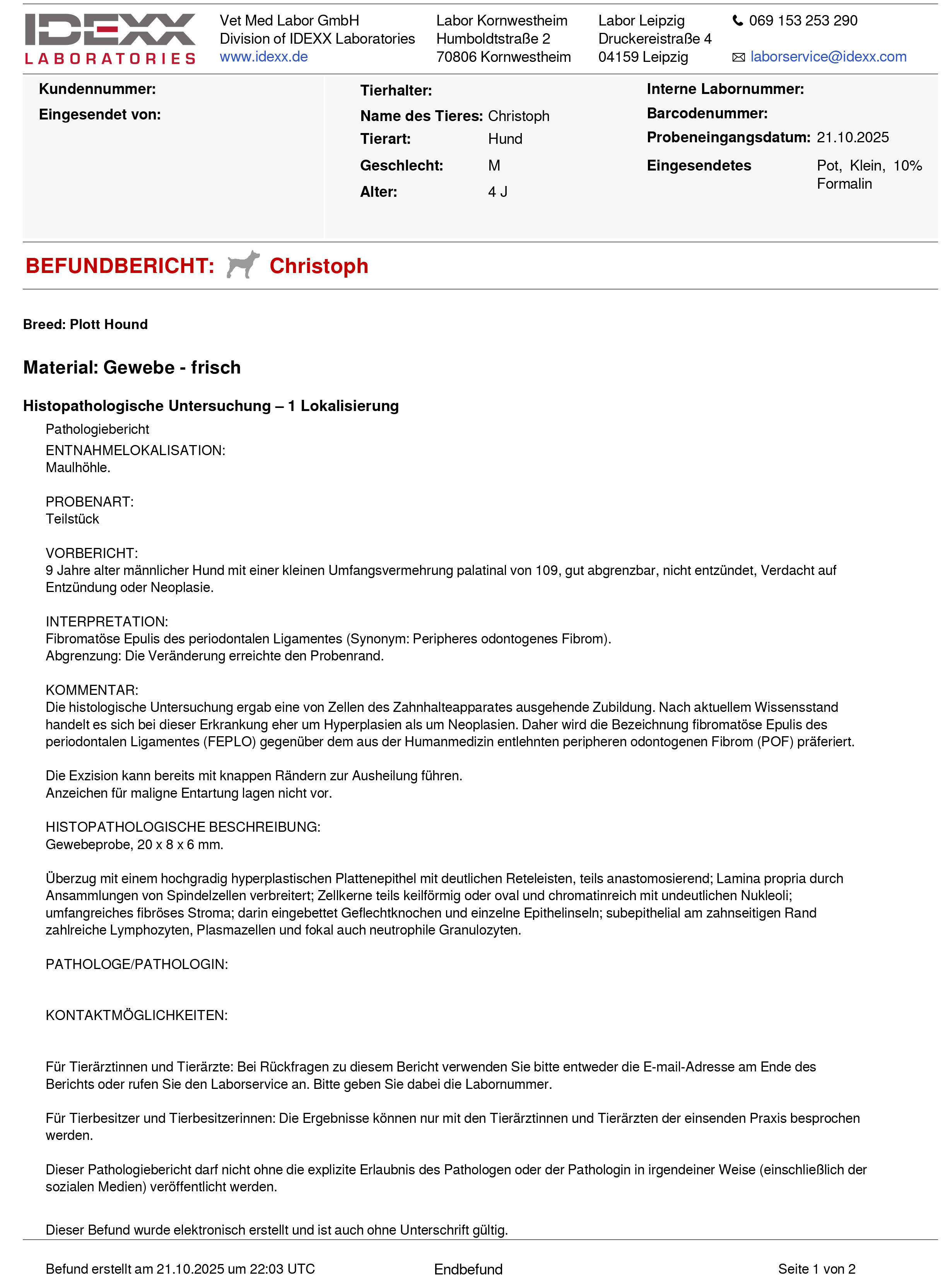 Diese Kommentare werden am Anfang des Befundes mit dem Vermerk „HINWEIS VON IDEXX“ versehen, um auf Updates beim Bearbeiten von Proben oder auf Maßnahmen hinzuweisen, die zum Abschluss der Bearbeitung erforderlich sind.